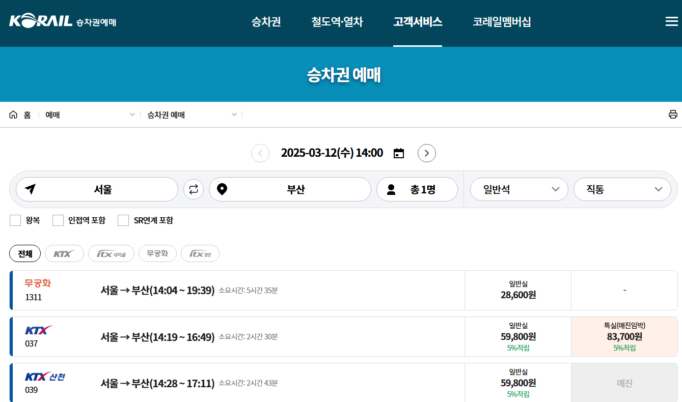 - 코레일 홈페이지 예매